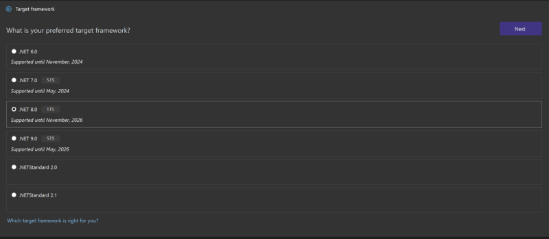 With the upgrade type ironed out, next, we need to select the .NET version to upgrade to. For our case, we are going for .NET 8.0 LTS; this is the expectation for 3ds Max 2026 .NET plugins. You may optionally get an action requirement to download and install .NET SDK if you don't have it yet; if so, proceed with that installation, then pick it up from here once done.
