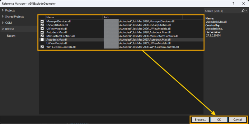 Menu > Project > Add Project Reference > Browse& find your assemblies. Once all intended libraries are selected, click OK to add them. Just as in the option above, the new assemblies will be added back into the project file. Just FYI, we can change the assembly paths for the Autodesk assemblies to make use of the path variables. This way, any user can use our plugin despite the installation path they chose. For our case, we will use the path as $(ADSK_3DSMAX_x64_2026)\<assembly name>.